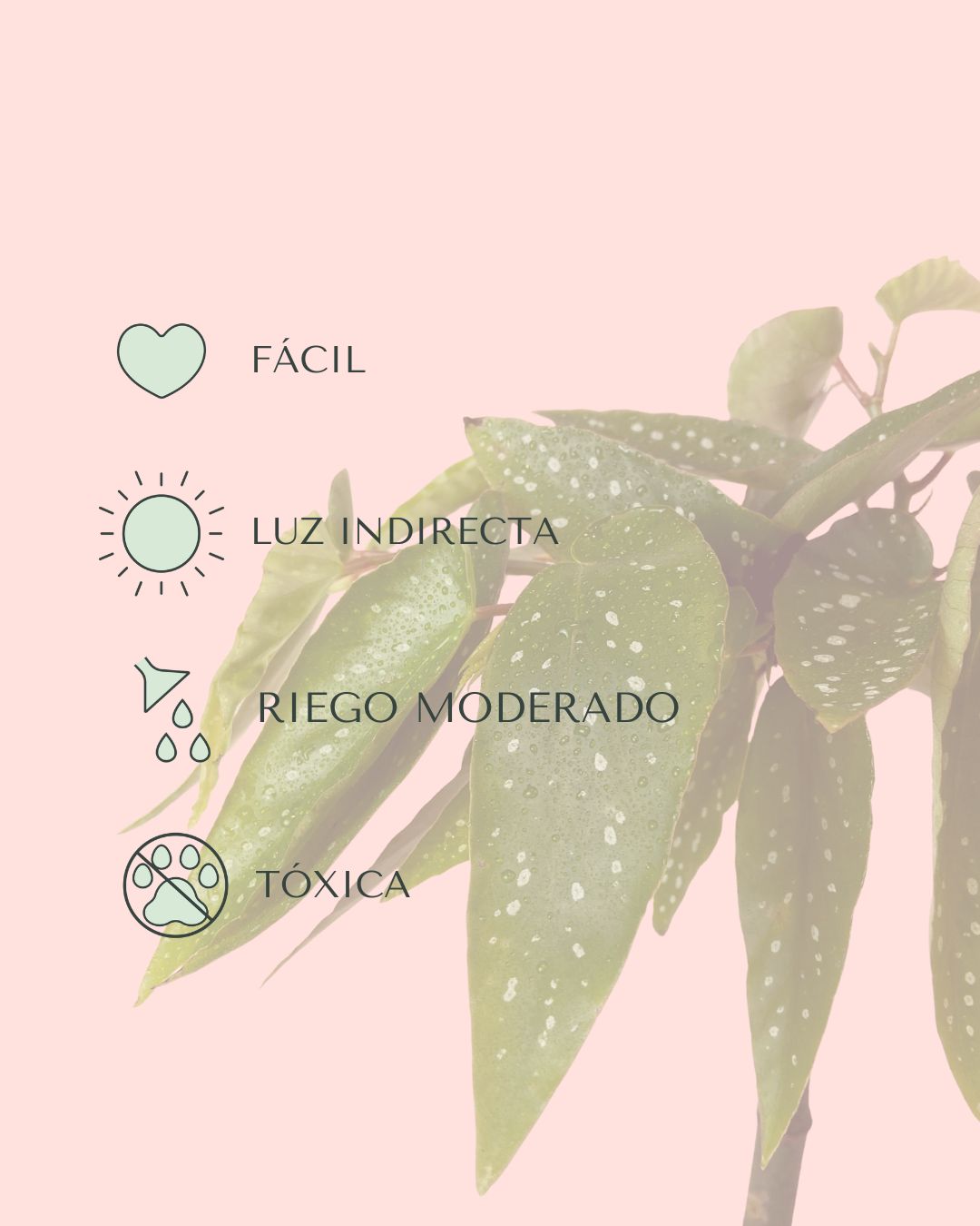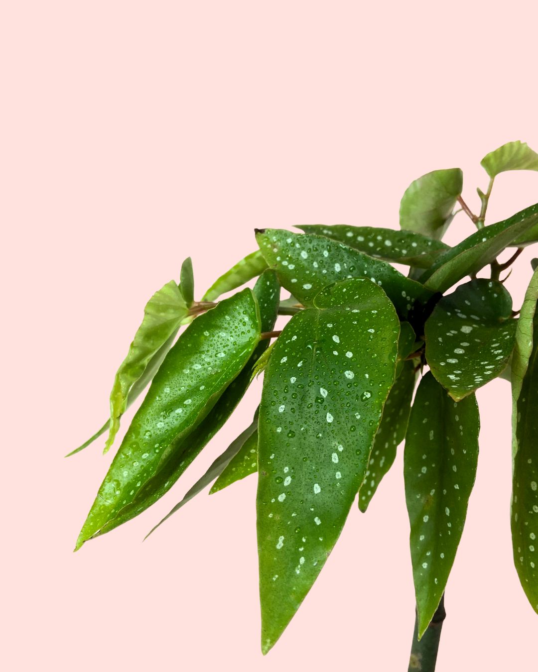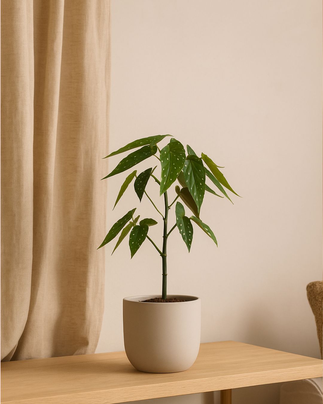 La Begonia Tamaya (Begonia maculata ‘Tamaya’) destaca por su porte vertical en forma de pequeños tallos que recuerdan a un bambú fino y elegante. De esos tallos surgen ramas laterales con hojas verdes cubiertas de lunares blancos brillantes, un rasgo muy característico.