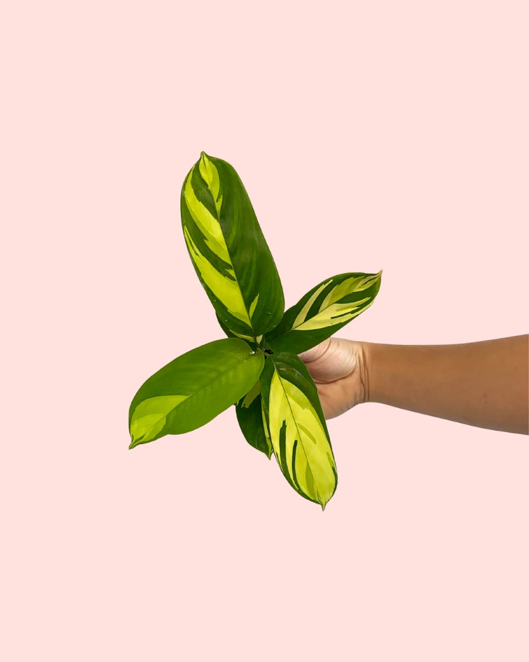 La Ctenanthe pilosa Golden Mosaic es una planta natural tropical de interior con un diseño vegetal que parece pintado a mano. Sus hojas ovaladas combinan tonos verdes y amarillos brillantes que iluminan cualquier rincón con un toque fresco y tropical.