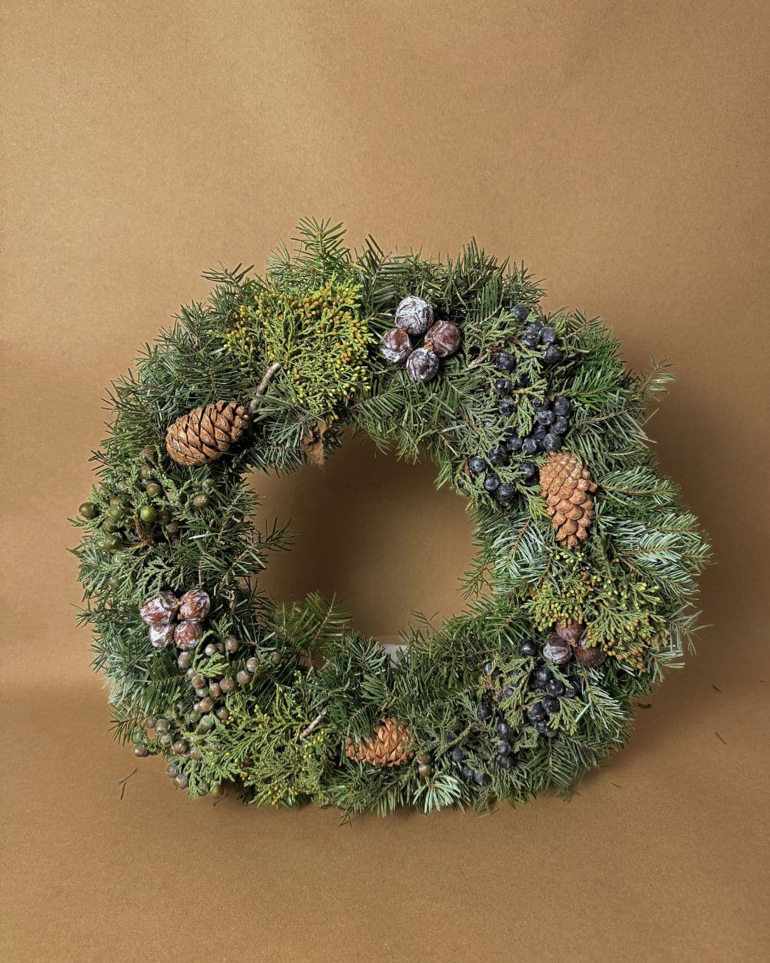 Su diámetro generoso la hace perfecta para puertas amplias, paredes principales o como corona protagonista en recibidores y chimeneas. Los detalles decorativos —sutiles y artesanales— equilibran el aspecto natural del abeto con un punto festivo elegante y atemporal.