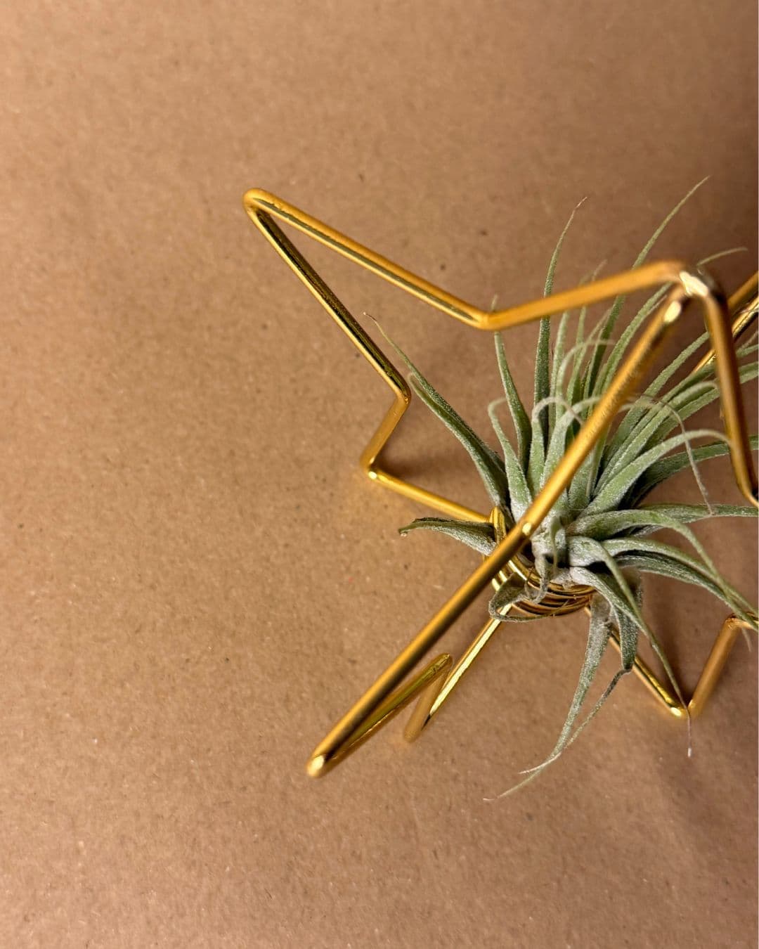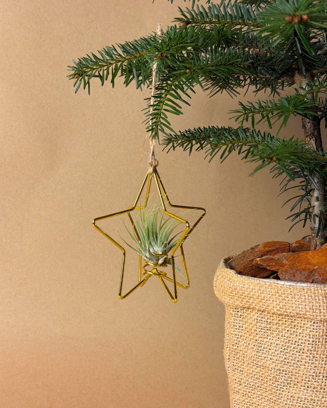 La Estrella Árbol de Navidad con Tillandsia es una pieza decorativa que combina el espíritu navideño con la frescura de la naturaleza. Esta estrella incorpora una Tillandsia (planta aérea) que no requiere tierra, solo luz y un poco de humedad. Ideal para colgar en tu árbol, decorar la mesa o regalar en fiestas.
