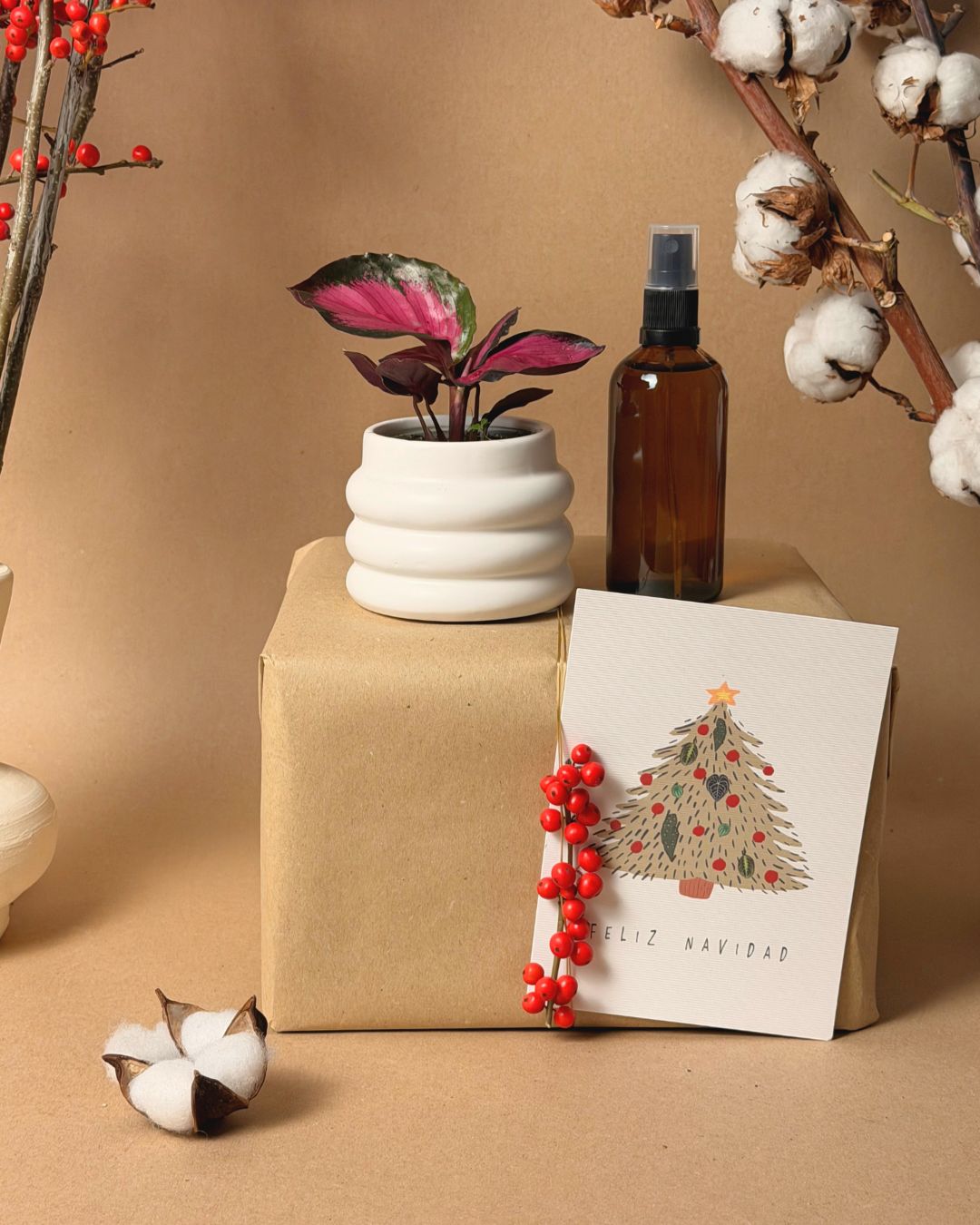 El Gift Set Aurore combina una Calathea Rosy Mini en maceta cerámica, un pulverizador ámbar y una postal navideña. Un regalo natural, elegante y lleno de encanto.