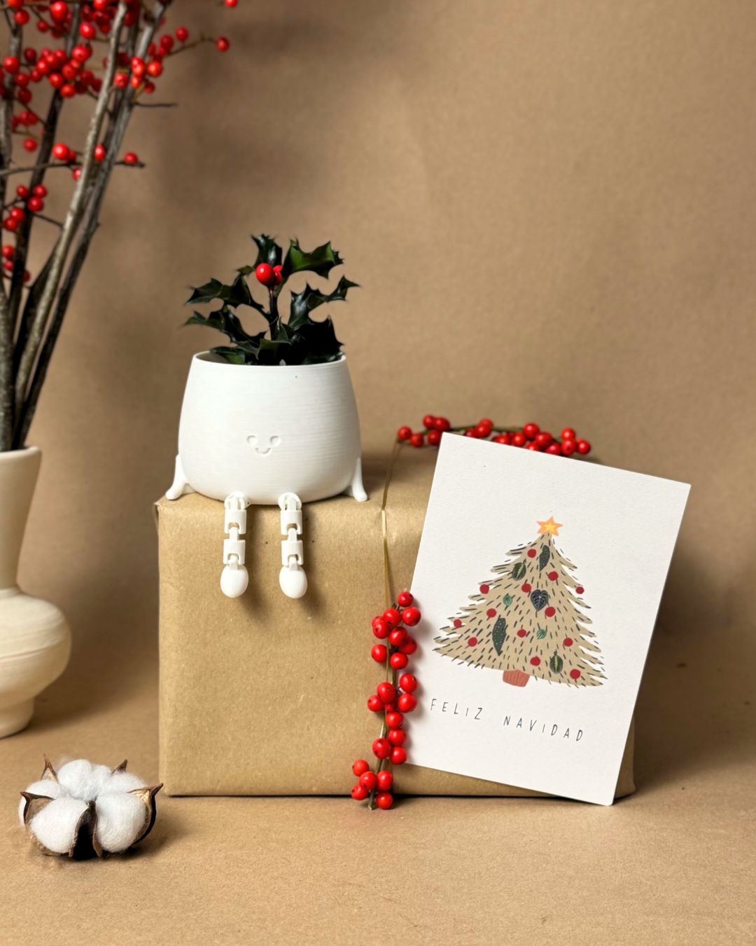 La Happy Pot Blanca es el complemento perfecto: su diseño limpio y su carita alegre iluminan el verde del acebo y convierten la planta en una pieza decorativa encantadora, ideal para mesas, estanterías o detalles navideños.