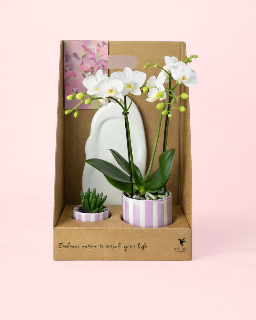 Este pack de orquídea y suculenta combina elegancia y suavidad en una composición equilibrada y muy decorativa. Incluye dos macetas lila y un plato a juego para colocarlas juntas, creando un conjunto armonioso y fácil de integrar en cualquier interior.