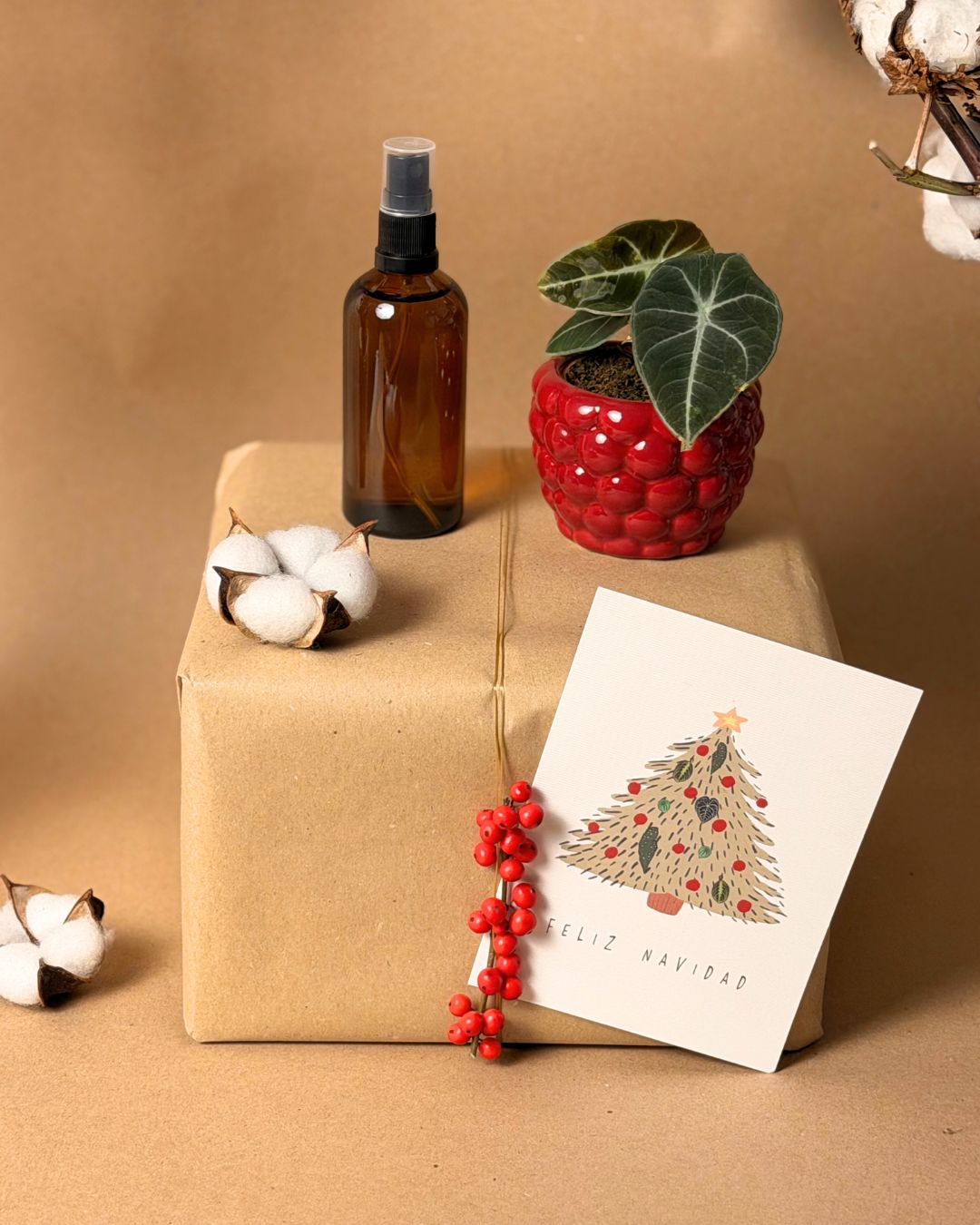El GIFT SET Velvet es un pequeño tesoro botánico pensado para regalar textura, misterio y un toque navideño elegante. Incluye una Alocasia Black Velvet Mini, una maceta cerámica Bubble, un pulverizador de vidrio ámbar y una postal navideña que completa el conjunto con cariño.