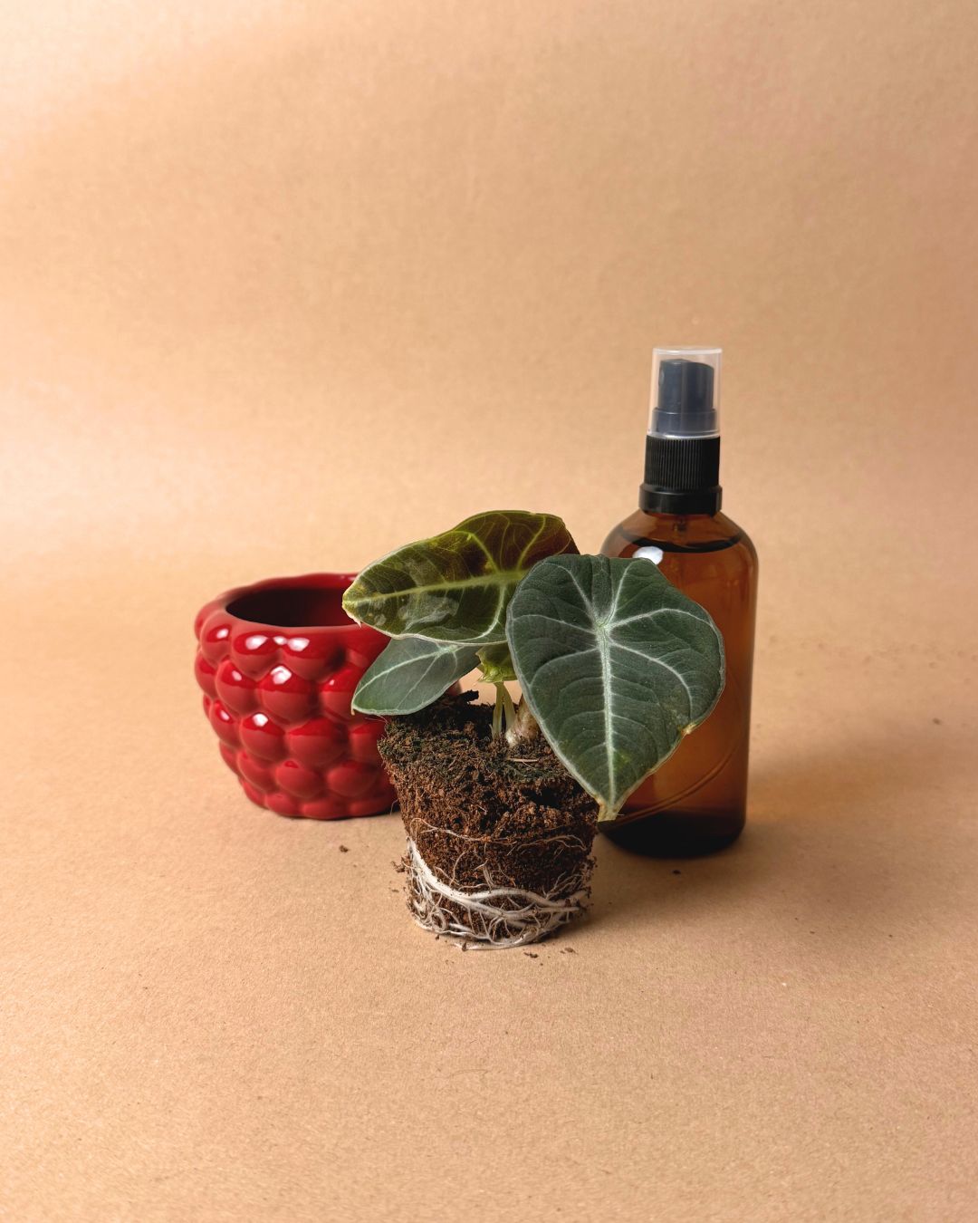 La maceta cerámica Bubble es el complemento perfecto: realza su aire exótico, le da estabilidad y convierte la planta en una pieza decorativa completa. El pulverizador, además de práctico, permite mantener la humedad suave que esta alocasia tanto agradece.