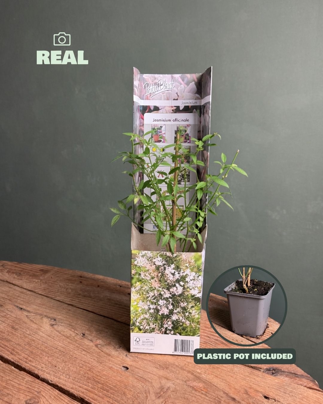 Jazmín officinale (jazmín común), planta natural aromática apta para interior y exterior en climas suaves. Maceta de Ø9 cm.