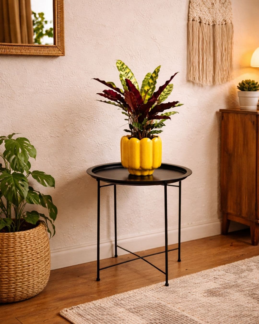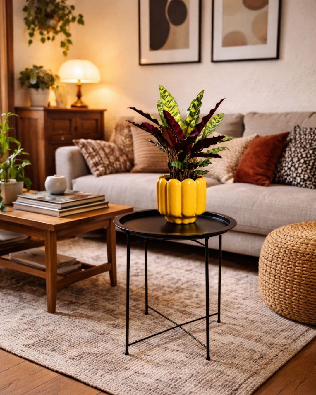 Un tip útil: combina esta mesa con plantas colgantes o de porte caído para aprovechar la altura y crear un efecto visual más dinámico.