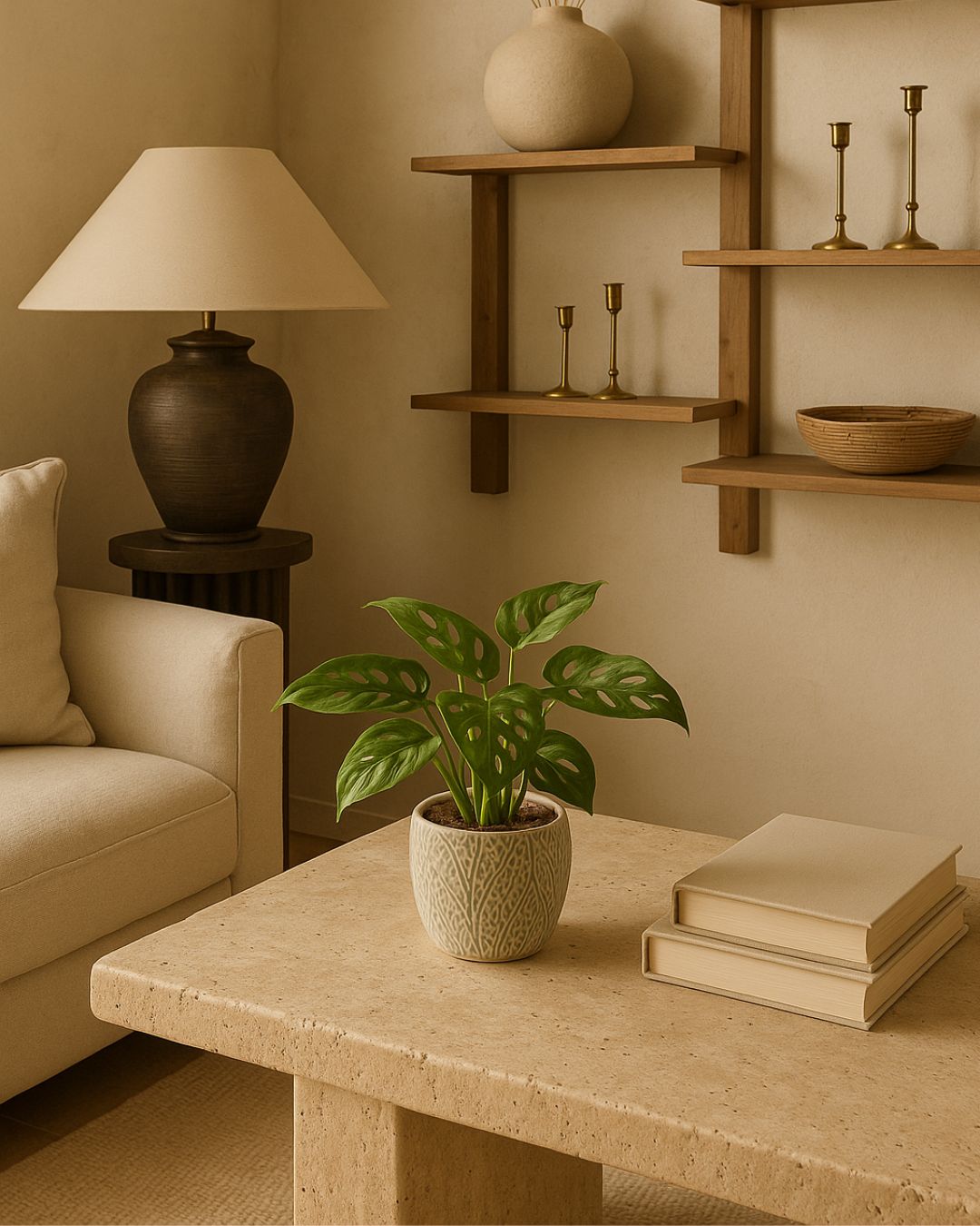 La Monstera Adansonii es una planta natural de interior tropical, resistente y purificadora. Sus hojas perforadas y su maceta cerámica blanca crean una pieza viva, elegante y fresca para cualquier rincón.