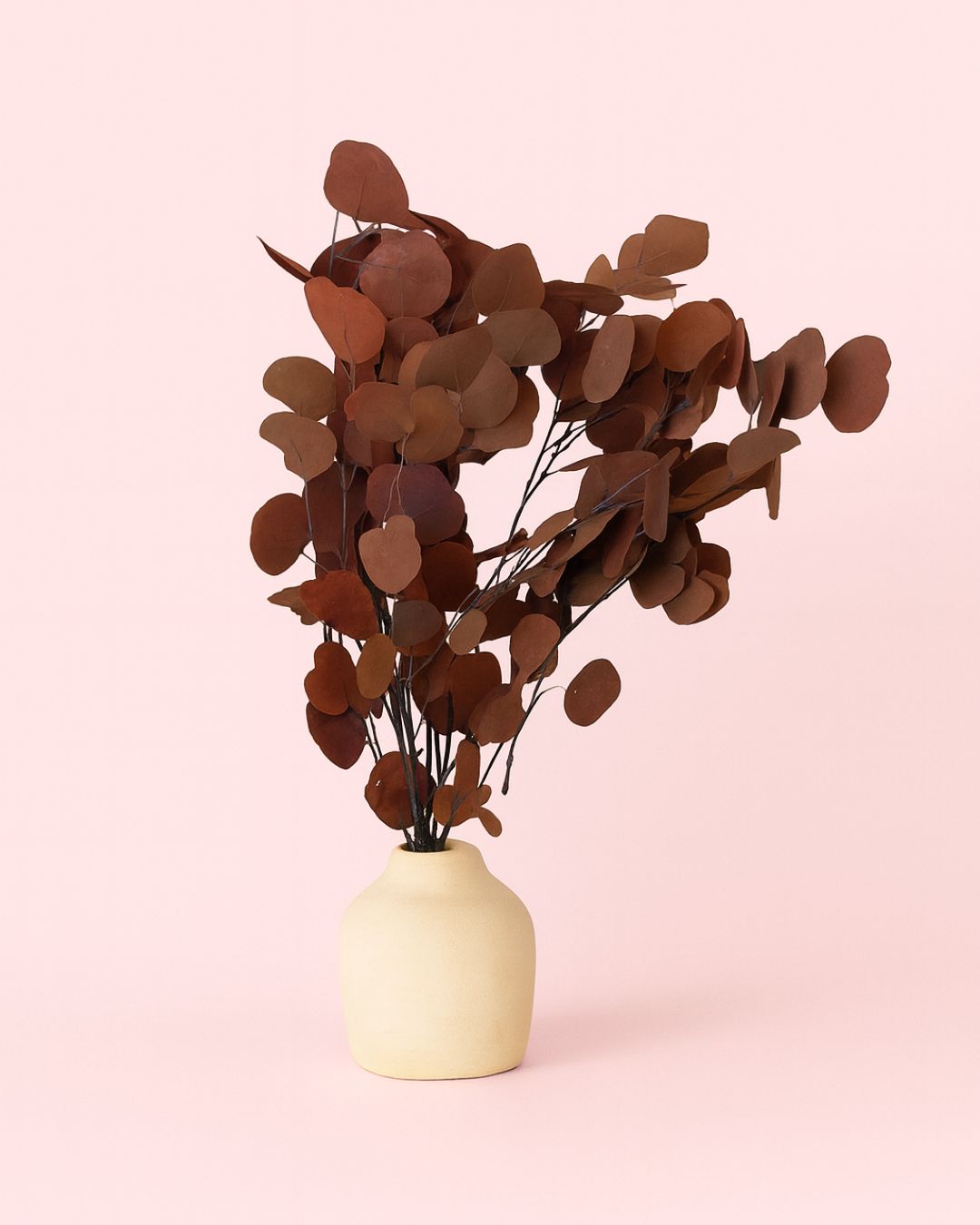 Cada ramo está elaborado con ramas de eucalipto real preservado, tratadas cuidadosamente para conservar su textura y flexibilidad durante años. Acompañado por un jarrón de diseño minimalista, este conjunto se adapta perfectamente a interiores modernos, oficinas, o como regalo elegante para cualquier ocasión.