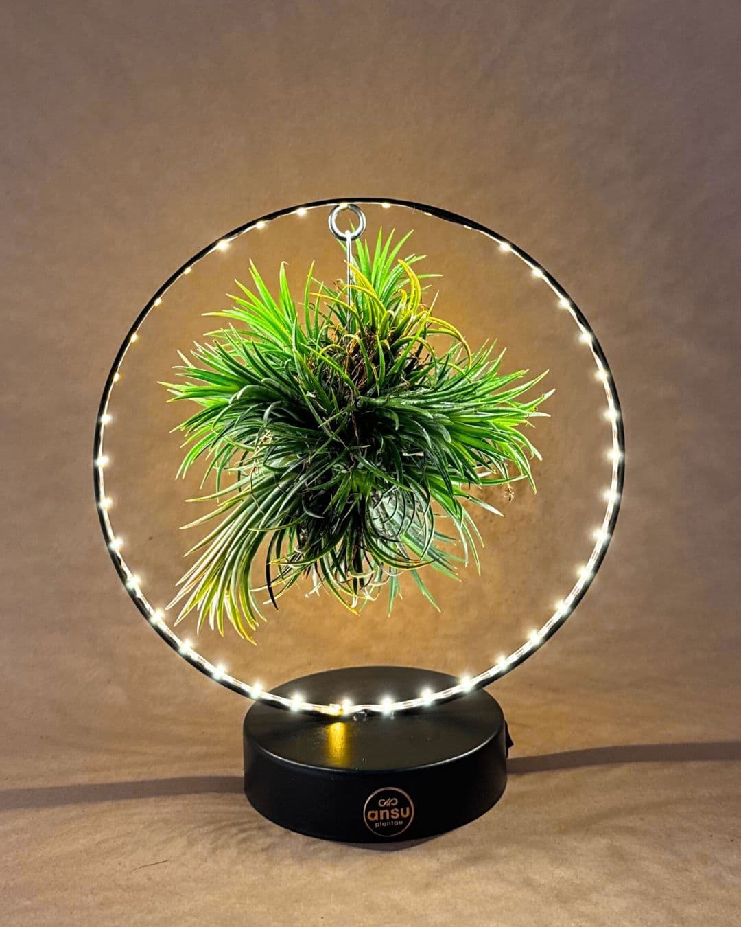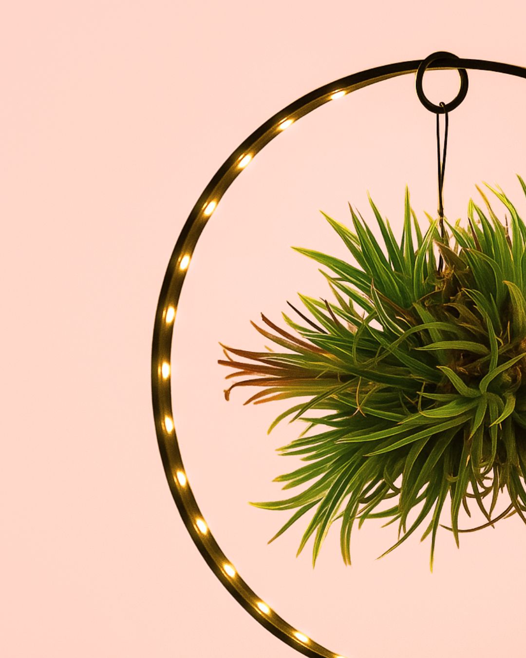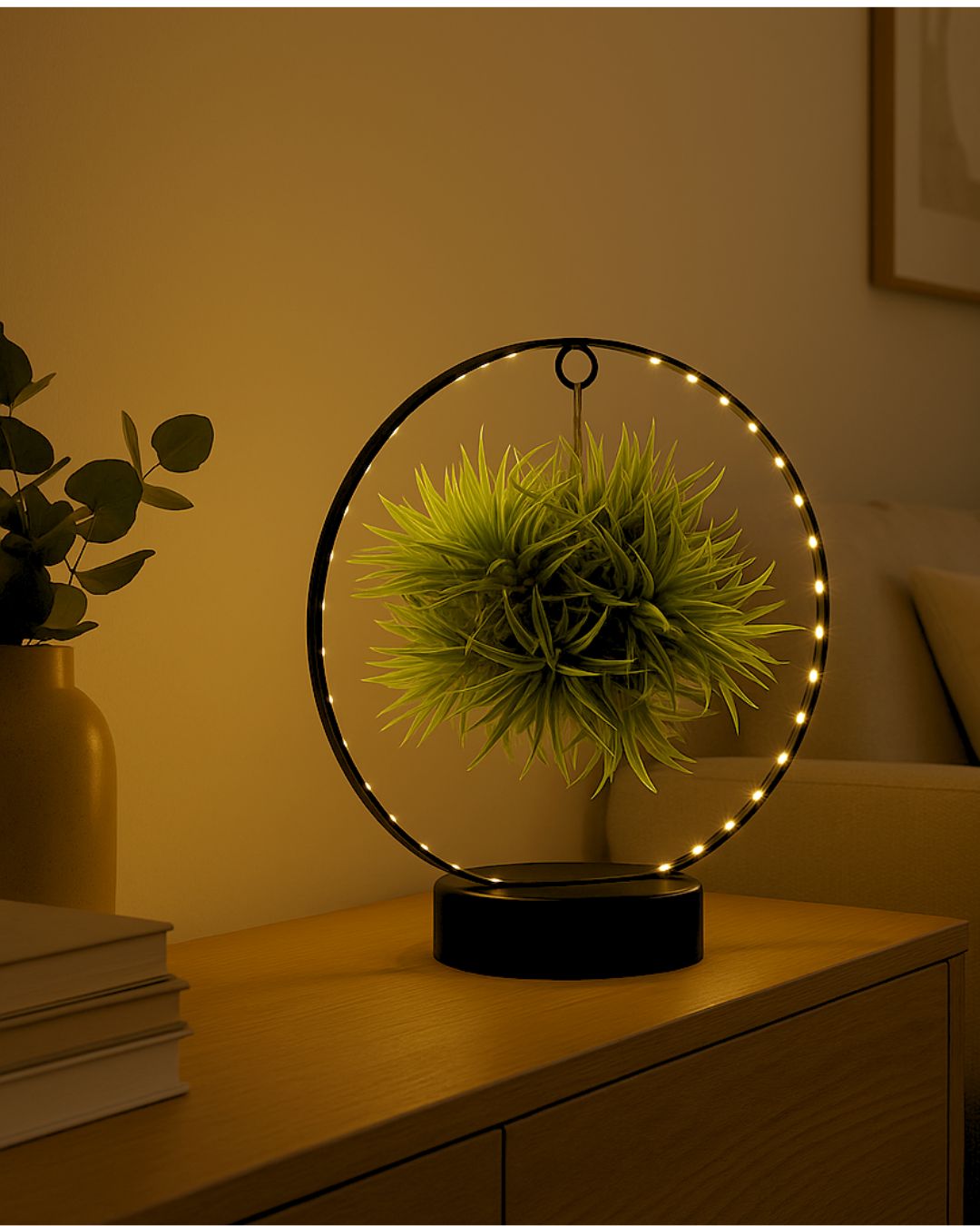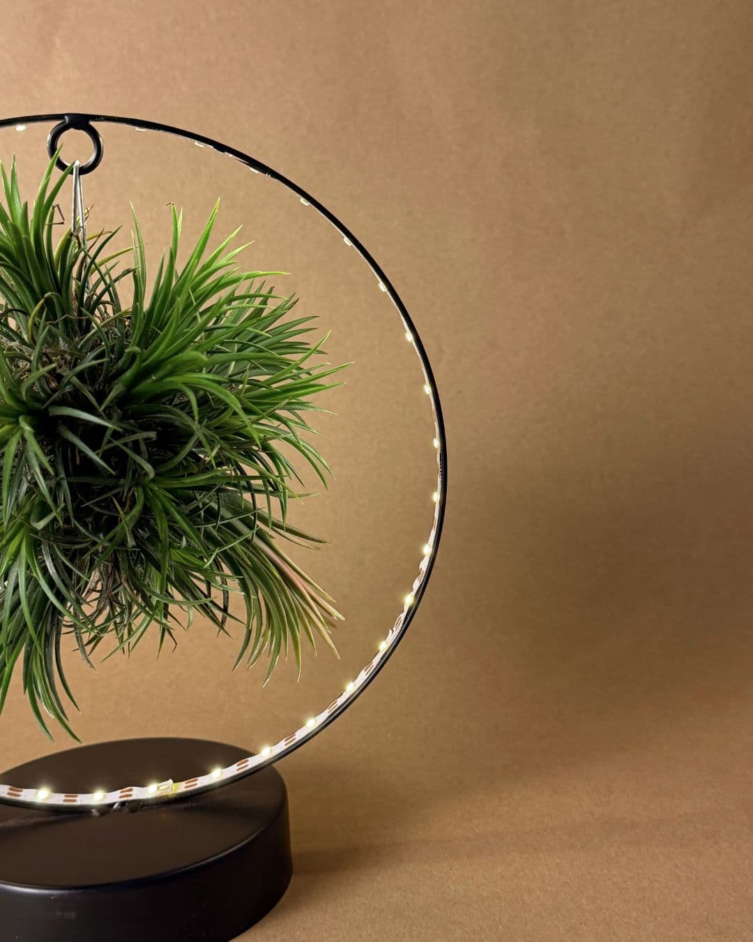 El Círculo de Metal Negro con Tillandsia y luz LED combina diseño y naturaleza. Su estructura moderna con luz cálida resalta la belleza de la planta aérea, creando una atmósfera elegante y natural.
