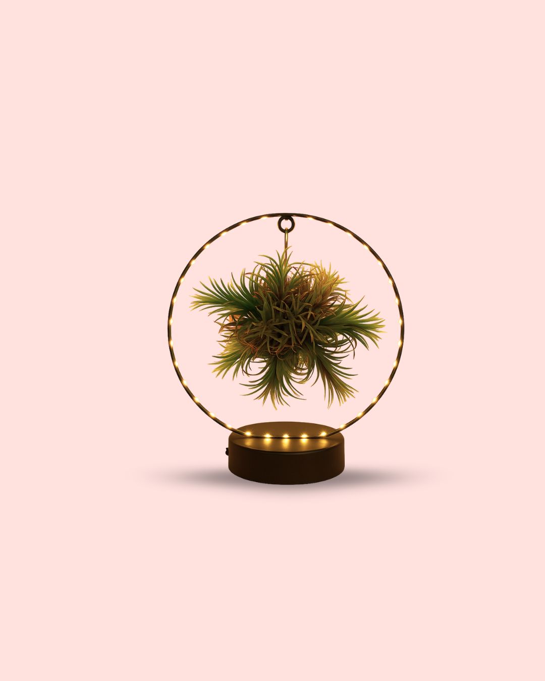Ideal para salones, mesitas o estanterías, este objeto une el encanto vegetal con la elegancia del metal y la sutileza de la luz. La Tillandsia, al ser una planta aérea, no requiere sustrato ni mantenimiento, lo que convierte esta pieza en una opción perfecta para quienes buscan decorar con estilo sin complicaciones.